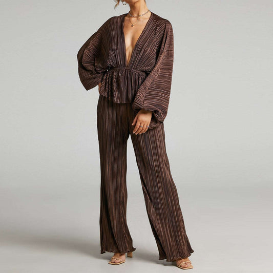Wide Leg Pants | Deep V-neck Two-piece Suit
