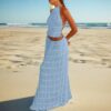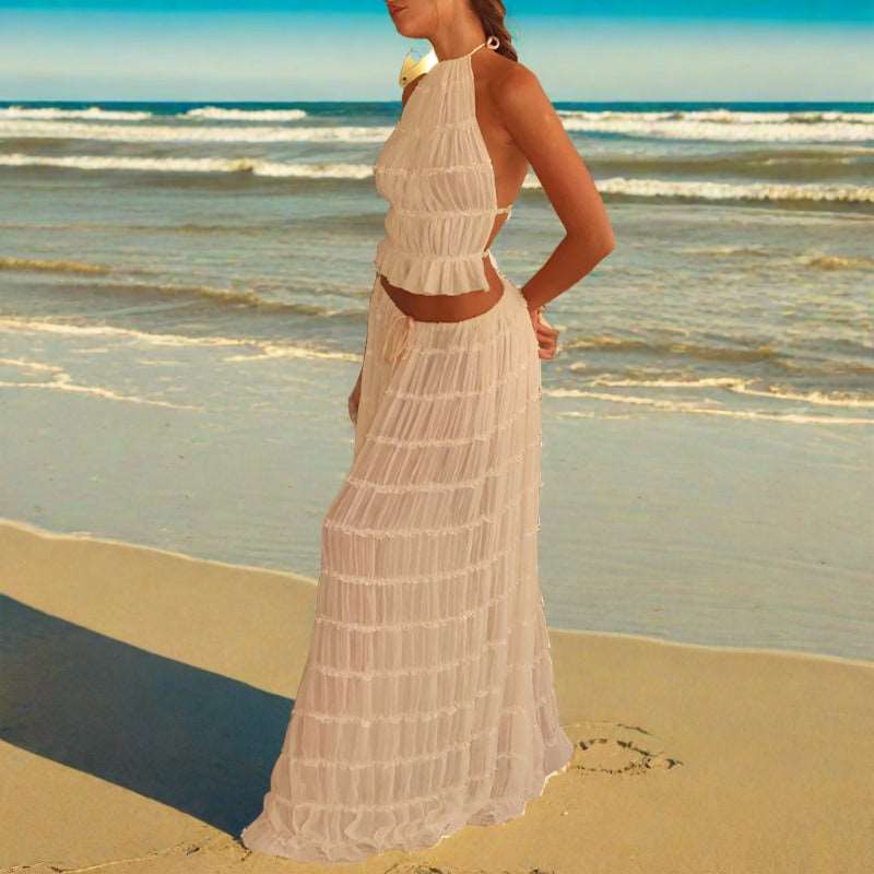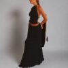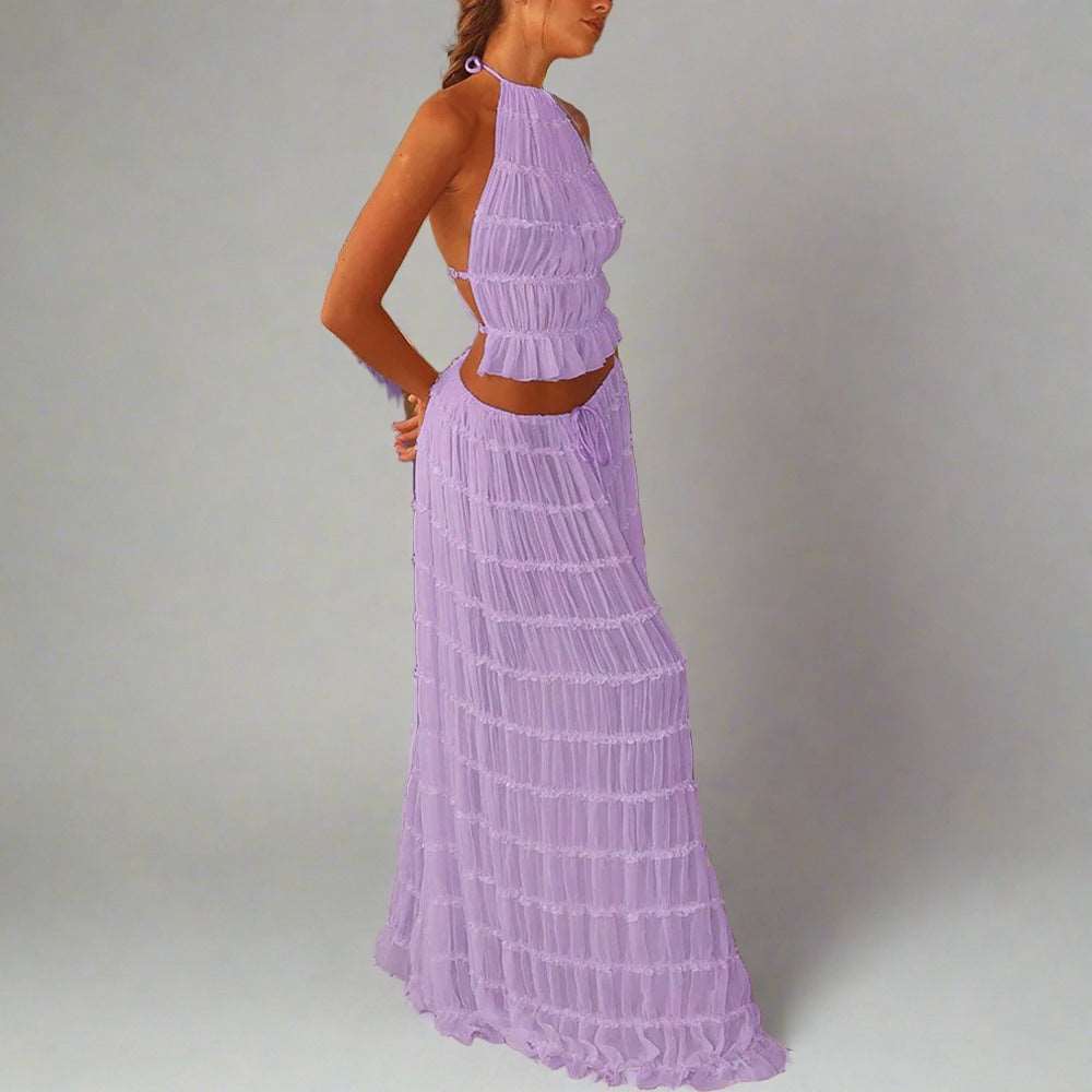 Upgrade your wardrobe with our trendy Maxi Dress. The two-piece suit features a sexy, sleeveless halter top and a pleated, oversized skirt, made with high-quality material for ultimate comfort. This unique design is perfect for any occasion, making you stand out in style. Get yours now!
